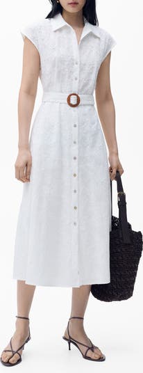 Embroidered flowers romance a breathable cotton shirtdress cut in an A-line silhouette framed by dolman cap sleeves and a wood O-ring belt.