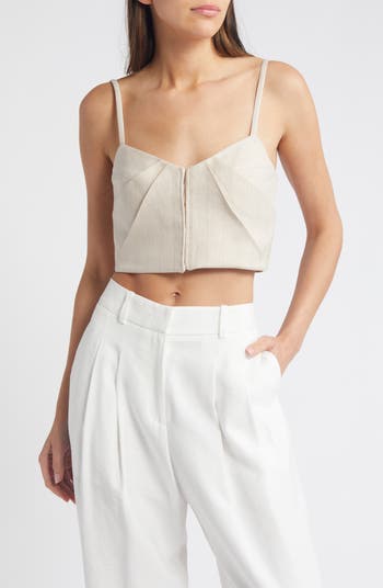 A pinstripe print and flared pleats infuse a formal feel into this crop top crafted from linen-enhanced fabric.