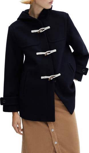 A trio of toggle closures lends a nautical note to a wool-blend coat fixed with a cozy hood.