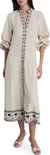 Inky geometric and palm tree embroidery trims a lightweight cotton shirtdress with blouson sleeves and an A-line silhouette perfect for market strolls or a seaside brunch.