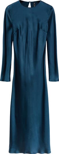 Chic style and sophistication best define this slinky satin midi dress designed with long sleeves for a more refined look.