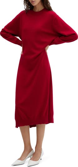 Rib trim details the crewneck, cuffs and hem of a soft, slouchy sweater-dress in a fiery red hue.