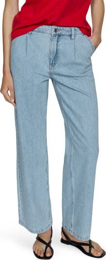 Front pleats add a refined touch to these straight-leg jeans crafted from nonstretch denim in a light-blue wash.