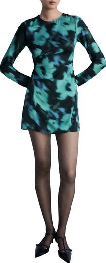 Delicate side ruching and a slight overlay at the skirt create stunning dimension on a long-sleeve dress cut at a stem-baring length.