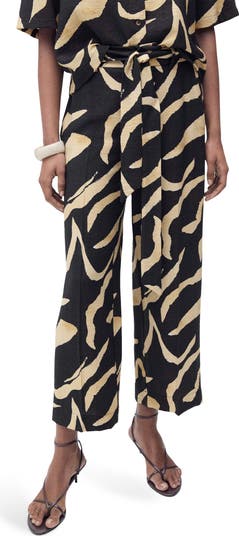 Take a walk on the wild side—these belted straight-leg pants in a slightly cropped length strut an unapologetic black-and-white animal print that refuses to blend in.