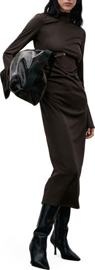 Draped ruching enhances the texture and dimension of this figure-skimming dress framed by a sophisticated mock neck and flouncy bell cuffs.