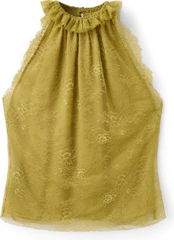Delicate lace and a ruffled collar tell a festive style story for a top designed to show off your shoulders.