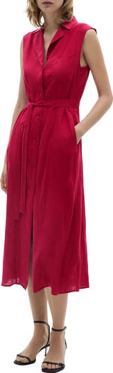 Sleek and sophisticated, this lightweight linen-blend shirtdress is updated in a vivid hue and a sleeveless silhouette for day-to-night appeal.