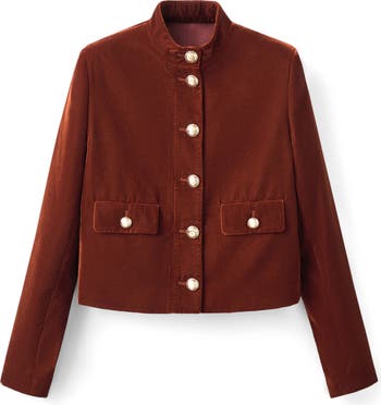A regiment of brassy buttons polished a velvet jacket offered in an earthy hue for a look that works for fun and fancy.