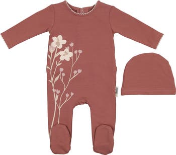A blooming floral print lends asymmetric detail to this long-sleeve footie paired with the perfect hat to keep baby nice and covered.