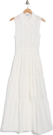 This sleeveless maxi dress is designed with a button-up front, a cinched waist for definition and a flowing tiered skirt for effortless movement.
