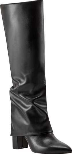 A pointy toe and block heel balance a sleek boot fashioned with a foldover silhouette.