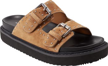 Adjustable straps are embellished with studs in this slide sandal that grounds you on a contoured footbed.