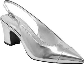 Glossy patent leather makes a gorgeous statement on a pointy-toe pump finished with a sweeping slingback strap.