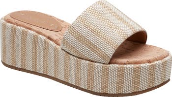 Crisp stripes bring eye-catching character to this retro-chic sandal set on a platform sole.
