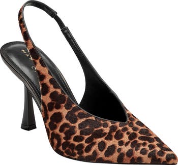A V-cut topline and pointy toe add crisp angles to a fierce pump lifted by a svelte flare heel and secured with an elasticized slingback strap.