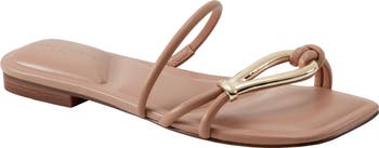 Asymmetric, tubular straps and geometric hardware add visual intrigue to a minimalist leather slide sandal furnished with a cushioned footbed for weekend-ready wear.