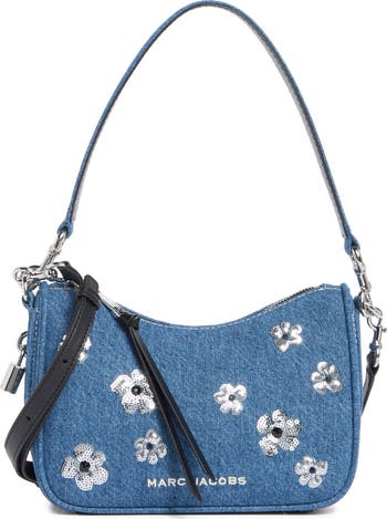 Iconic daisies and a curved silhouette defines a right-sized shoulder bag rendered in casual blue denim and outfitted with an optional crossbody strap for versatility.