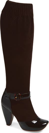 Glossy patent caps the tipped-up toe of this slouchy Italian-crafted boot wrapped by a tortoiseshell belt at the shaft.