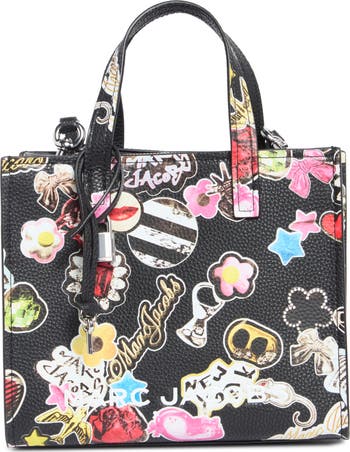 A vibrant print featuring sticker-inspired motifs of classic and archival Marc Jacobs iconography stands out against the durable leather exterior of a structured satchel.