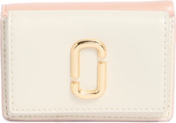 Gleaming logo hardware highlights the crosshatched exterior of a compact trifold wallet perfect for storing your monetary essentials while on the go.