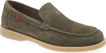 A moc-seam toe enhances the classic appeal of a soft suede loafer constructed with smooth leather lining and a durable grip sole.