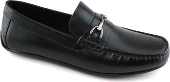 A sleek bit adds a touch of shine to a handcrafted driving shoe made from supple calfskin leather with traditional stitching and a flexible rubber sole.