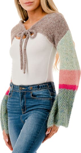 Throw on an extra layer for chilly days with this cozy bolero that's crocheted from supersoft yarns and rendered in blocky coloring.