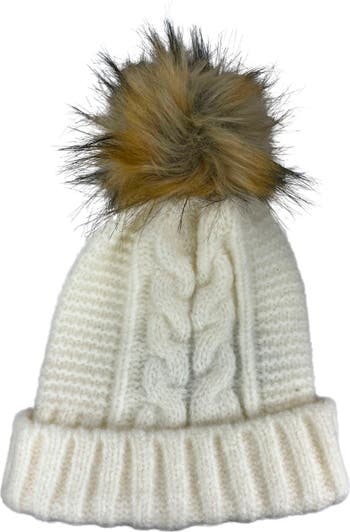 A faux fur pom adds a playful touch to this toasty beanie knit in a cable pattern.