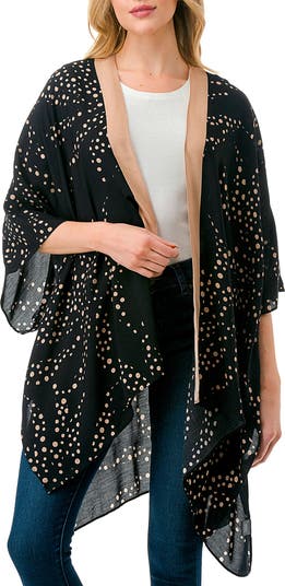 Vivacious dot printing punctuates across a lightweight, duster featuring dramatic wide sleeves for an ultrachic, layered look.