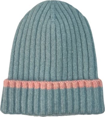 Cozy season calls for styling this rib knit beanie that's finished with a wide striped cuff.