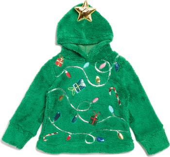 Your kiddo is sure to win the holiday sweater contest wearing this cute and festive hooded sweater knit from faux shearling to look like a Christmas tree with appliquéd ornaments.