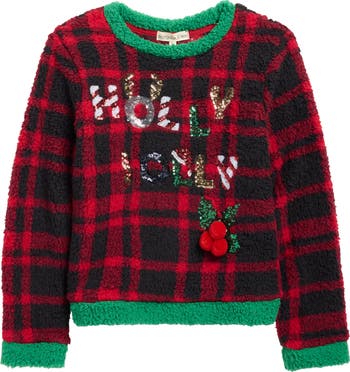 Keep your kid cozy during the holidays in this festive plaid faux-shearling fleece pullover illuminated by sparkly sequins.