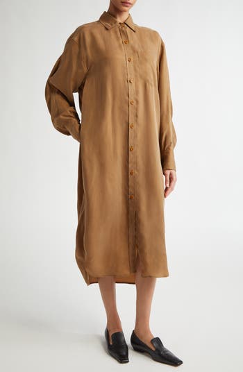 Maria McManus draws inspiration from the wardrobe-essential trench in this slinky midi shirtdress finished with a cape-style storm flap.