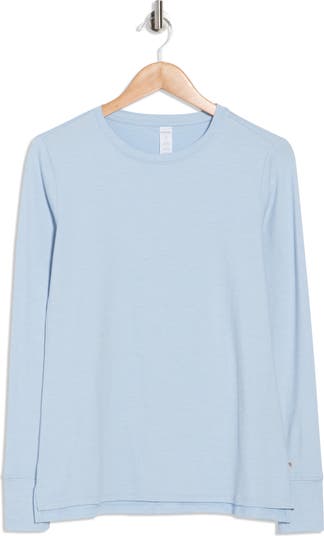 Sporty thumbhole cuffs and a high-low hem frame this long-sleeve active top cut from soft brushed jersey for maximum comfort.