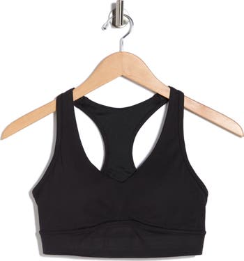 A V-neck racerback sports bra is cut from ultrastretchy, moisture-wicking fabric to help you stay cool and dry during workouts and finished with a thick elasticized hem for extra comfort.