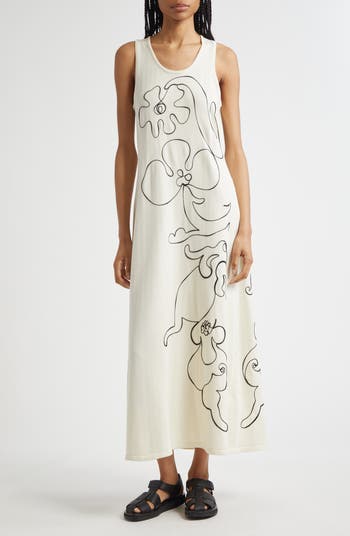 A finely embroidered floral design stands out on the front of this cotton dress.