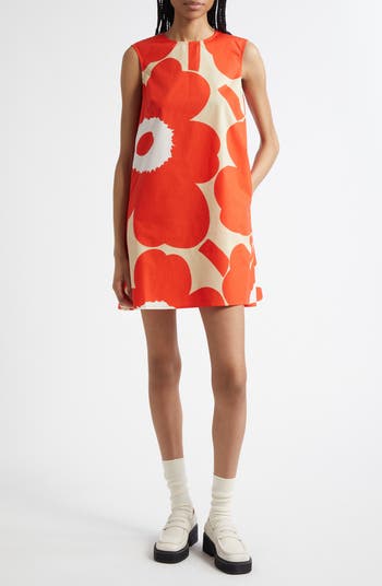 A mod shift silhouette and the label's iconic Unikko pattern—first introduced in 1964—bring a retro vibe to this loose and flowy minidress cut from organic-cotton poplin.