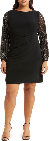 Beaded chiffon sleeves bring elegant shimmer to a ruched cocktail dress crafted in a stretchy sheath silhouette.
