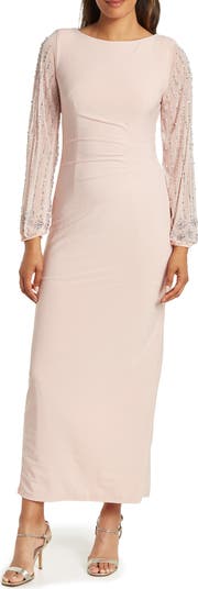 Glimmering beaded sleeves and subtle gathers at the waist offer an elegant touch to this evening-ready gown.