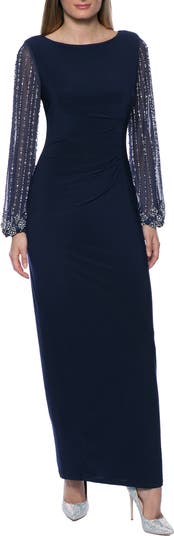 Glimmering beaded sleeves and subtle gathers at the waist offer an elegant touch to this evening-ready gown.