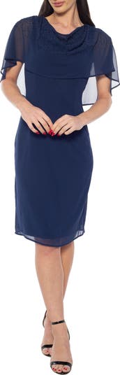 Go from cocktail hour to the dance floor with elegant ease in this silhouette-skimming chiffon dress styled with a beaded cape overlay.