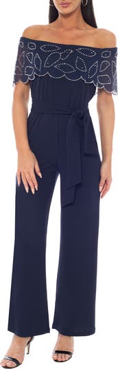 A scalloped off-the-shoulder neckline sparkles with crystals on this wide-leg jumpsuit that is made to stun.