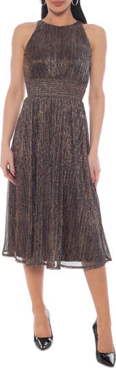 Show off party-ready shine in this metallic plissé midi dress fashioned with a smocked waist above a gracefully flared skirt.