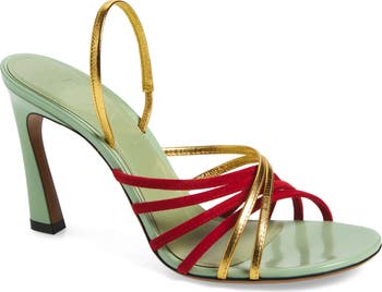 A strappy profile fashioned from mixed leather defines this statement slingback sandal elevated on a sculptural heel.