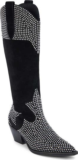Ornate stitching and a curved topline define this Western-inspired boot adorned in gleaming studs and lifted by an angled stacked heel.