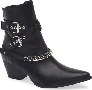 Gleaming buckles and curb-chain trim bring moto attitude to this sleek faux-leather bootie framed by a pointed toe and angled block heel.