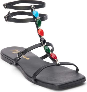 Colorful embellishments and slender adjustable straps distinguish a chic, flat leather sandal.