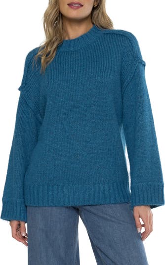 Dropped shoulders enhance the relaxed fit of this soft sweater knit with exposed seams and anchored by ribbed trim.