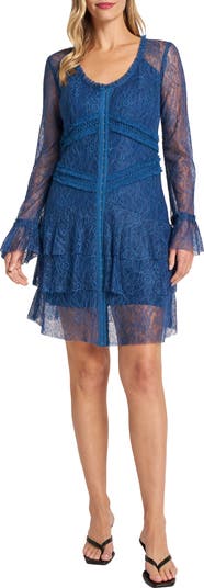 Enchanting at every occasion, this scoop-neck minidress is fitted to flow with rich romantic lace and a flouncy tiered skirt.